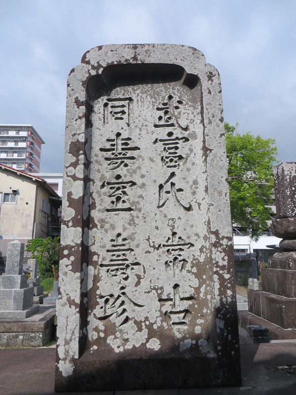 武富常古・寿珍(武富廉斎の両親)の墓は、佐賀市呉服元町・称念寺に建っており高さ2.5m余りの巨大なものである。 その文字は、「やげん彫り」という特殊な工法で彫られており、柔らかな文字の筆感が墓石に表現されている。