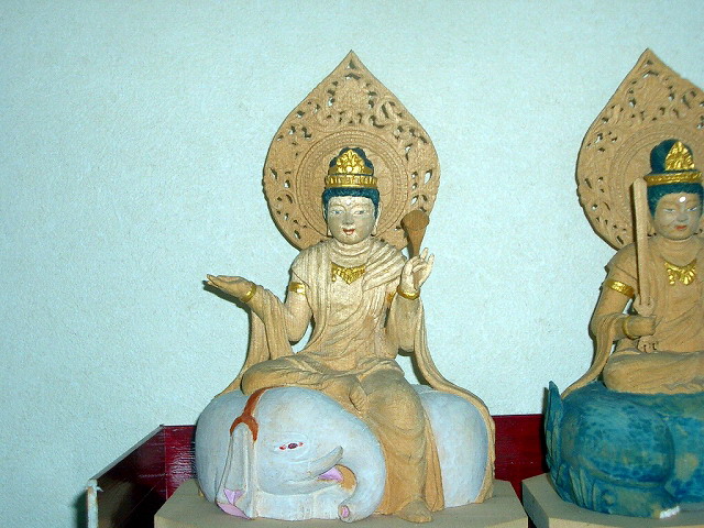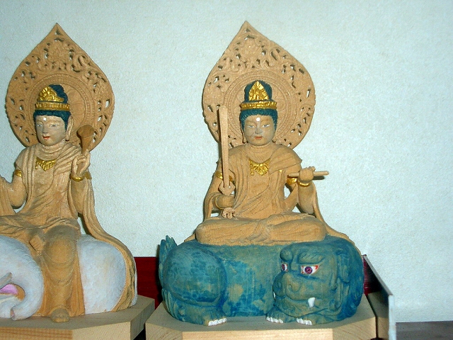 出羽の玉林寺本堂前に観音像を中にはさんで、北に東面して獅子に座った文殊菩薩の石像と、南に経巻をひもとき象に座った普賢菩薩の石像が安置されている。この二尊は菩薩の最上位にあるとされ、この両菩薩が釈迦如来の脇持として配されたのも、この両尊が理(普賢)と智(文殊)を司どる仏だからであろう。