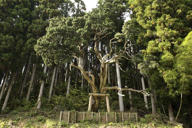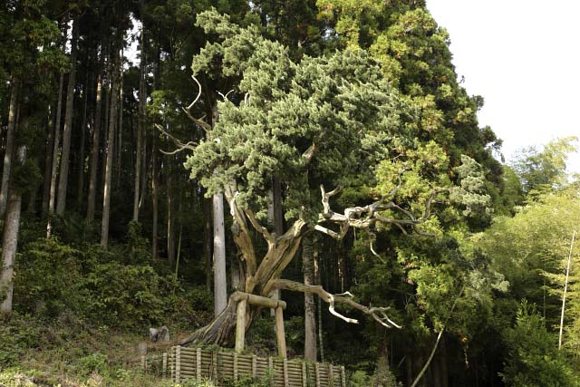 大野のビャクシン(ヒノキ科)は県内では諸富町新北神社のものに次いで大きい。本樹を残すために道路を迂回させたといういきさつがある。