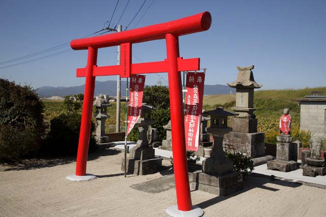 その石祠の右側面には「明治三十九年午六月七日」とある。台石を見る。前面には、大立野寄附人、石川又八外48名の名前が刻まれ、後面に「上砥川村谷、石工永石佐吉」と、石面に「発起人鍵山俊八・塚原佐喜造、白濱多藏、原田源七、霧島令辰」と刻まれている。