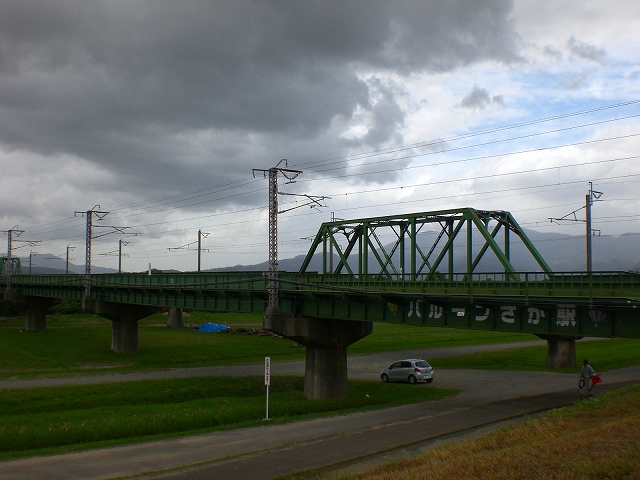 最初の鉄橋は明治28年5月5日に竣工。その後昭和38年3月に架け替えられた。昭和41年6月複線化に伴い、上り線用に新しい鉄橋(長さ253m)を架設し、従来の鉄橋(249m)を下り線用とした。昭和51年7月1日に全線が電化されて現在に至っている。