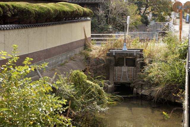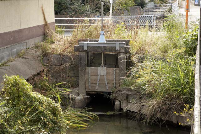 開成6丁目の中央の新村川と立体交差している井樋である。新村川が人工河川である証拠でもある。昔は掘の幅も広く草等無く新村の幹線排水路として大事に管理されて来た井樋と水路である。この井樋を締めれば、上流の旧新村の地域内の堀の水は下流には全然流れない。5月頃田植が近づけば、井樋は締められ、井樋番がきめられていて、洪水となれば速やかに開放される。