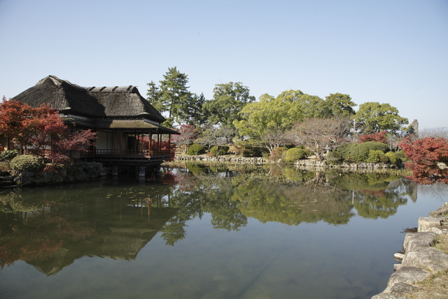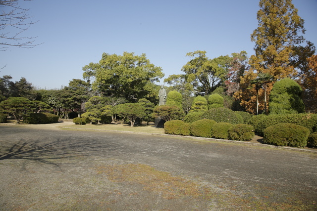 正面から入った所にある二棟の建物が当時の別荘で、園内には多布施川の清流を引いた池があり、築山は老松古梅その他の樹木が雅趣を添えていた。