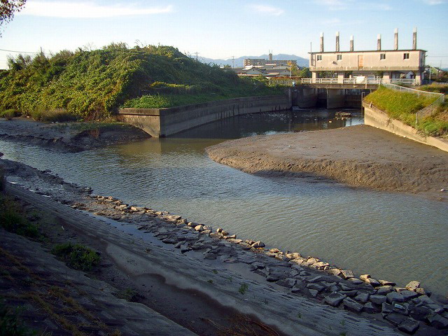 佐賀市東部・北部2,400haの穀倉地帯、住宅地域を水害から護るために設けられたもので、佐賀江川・巨勢川との分岐点にある。排水機能を増大させるため、次々に改造している。最初は昭和17年5月。河川法で県が管理、従来の慣行は黙殺された。そばの「八田江改修記念碑」に事業概要が刻まれている。