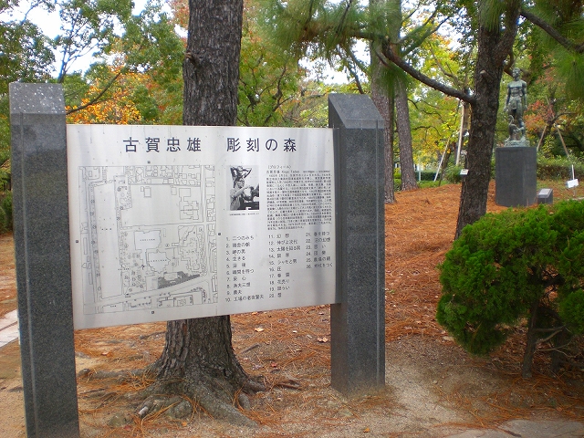 彫刻家、古賀忠雄のブロンズ、石膏の彫像26体の作品が博物館・美術館の南側・南堀の散歩道(佐賀城公園)に設置され彫刻の森をつくっている。 また、佐賀県庁舎と佐賀県立図書館との間に「愛と平和」の像が、平和の塔建立期成会の手で建てられている。この「愛と平和」の像は、昭和39年に建立されたものである。