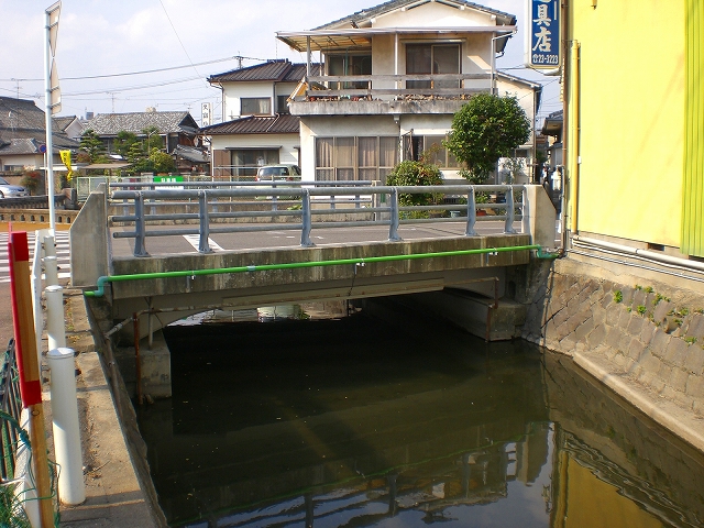 常喜橋のすぐ側の裏十間川が南に曲がるところにあって、明治22年の『市制施行当時之佐賀市街図』には、旭橋はないので、牛島町から思案橋等の方面に新道路を建設したときに架橋したものと思われる。