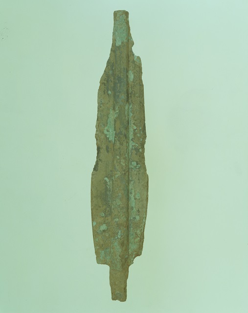 細形銅剣は、弥生時代の2号土壙墓から出土した。鋒部を欠損し、全体の3分の2程度が残存している。残存長19.2センチメートル、最大幅3.9センチメートル、茎長2.3センチメートル、茎幅1.15センチメートルを測る。翼両側及び脊には刳込下部に至るまで、明瞭な鎬(しのぎ)が研ぎ出されている。元部においては、脊(むね)には鎬は及ばないが、翼両側には緩い研ぎ出しが行われている。関の片方を欠き、刃部も片方は刃こぼれが著しい。