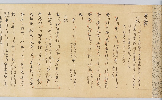この本の東遊歌に続いて記されている神楽歌(かぐらうた)は、もともと神前で奉納する楽舞であるが、その中でも宮中で奏される特定形式の神事歌謡を集めたものである。宮中向きに歌詞や曲調の構成に工夫したものであり、この宮神楽は宮中の清暑堂で奏されたが、長保4年(1002)からは内侍所(賢所)の前庭において奏されるようになった。当日夜になって篝(かがり)火をたいて、神をお迎えする歌舞から始まり、ついで神をなぐさめ、人も楽しむ歌舞が主要部で、最後に神を天にお送りする歌舞が、夜が明けるころに終わるという構成になっている。一夜を歌い舞うので歌の数も多い。