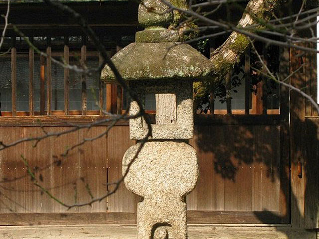八太郎槇の近く、庫裏南側塀前にある燈籠で、竿石も少し偏平で上方に円く張り出しがあって、その上に正面四角の笠をのせてある。これは桃山時代の茶人古田織部が考案したものだそうで、それから織部型の名が出たのである。 織部型の竿を変型十字架と見て竿下方に彫ってある立像を宣教師像と見てこれは潜伏切利支丹の信仰物として考案されたものだとも言われている。