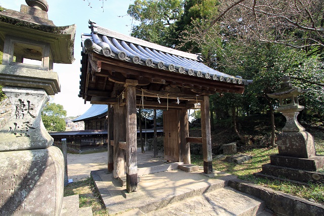 本殿西北方に西門と称する本瓦葺き、切妻造りの四脚門がたつ。