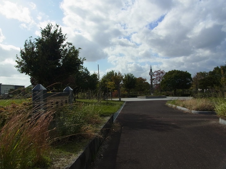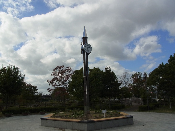 ※写真は巨勢公園。真崎鉛筆をイメージして作られた鉛筆型の時計塔と看板